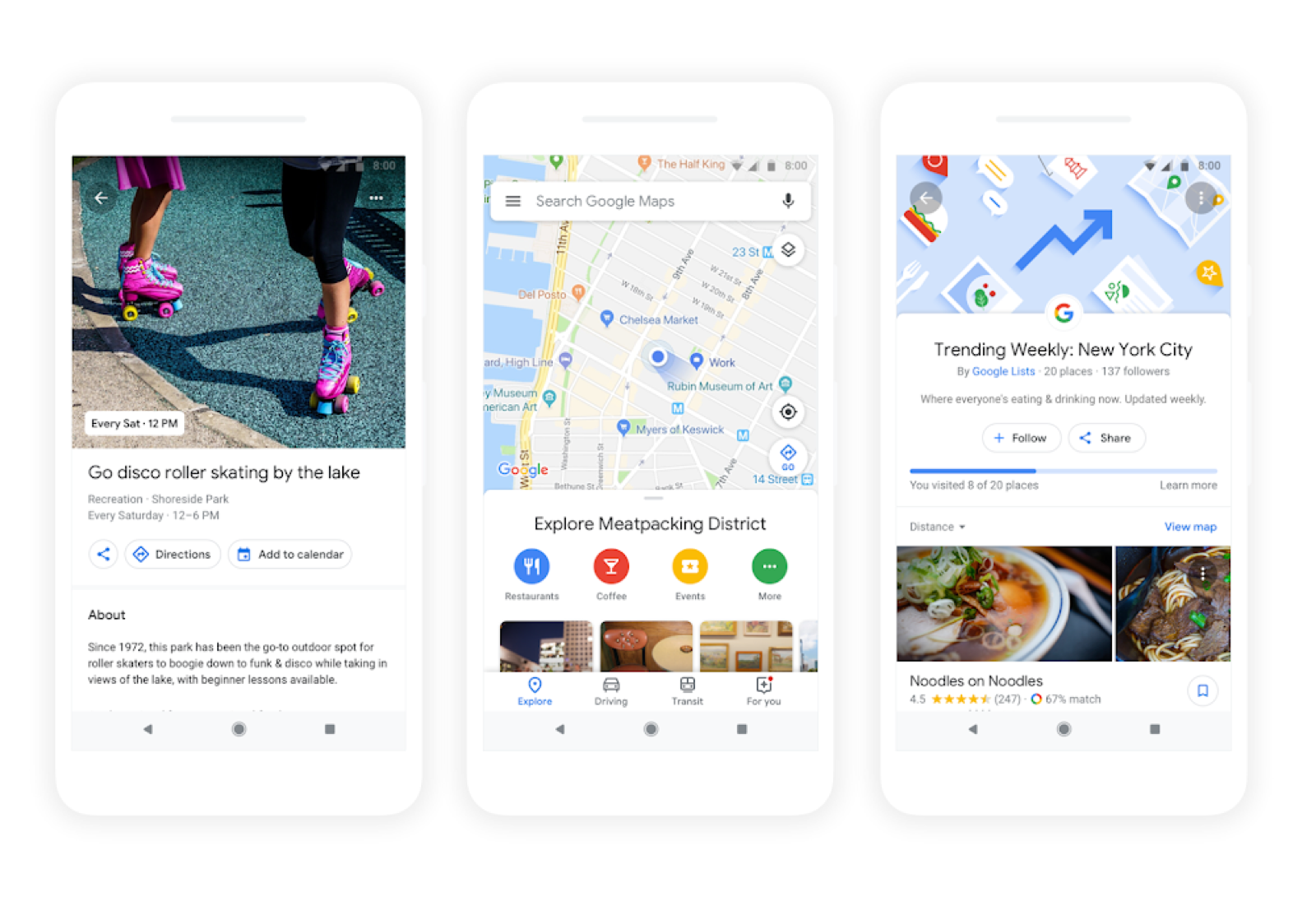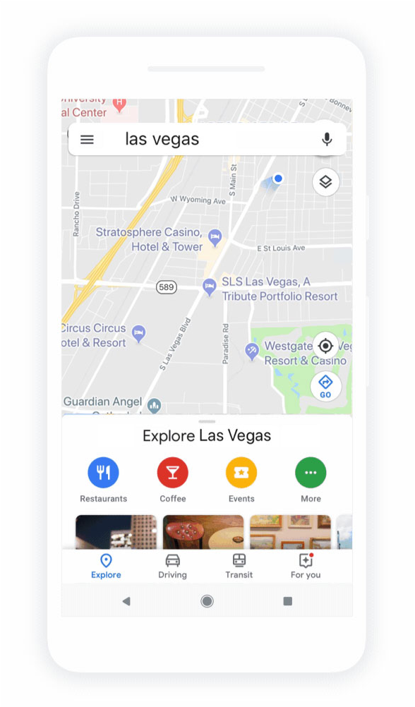 This tab highlights everything new and interesting nearby. When you look at a certain area of the map, you’ll be shown options for dining, events, and activities. It also incorporates top trending lists based on information from local guides, trusted publishers, and Google’s algorithms.